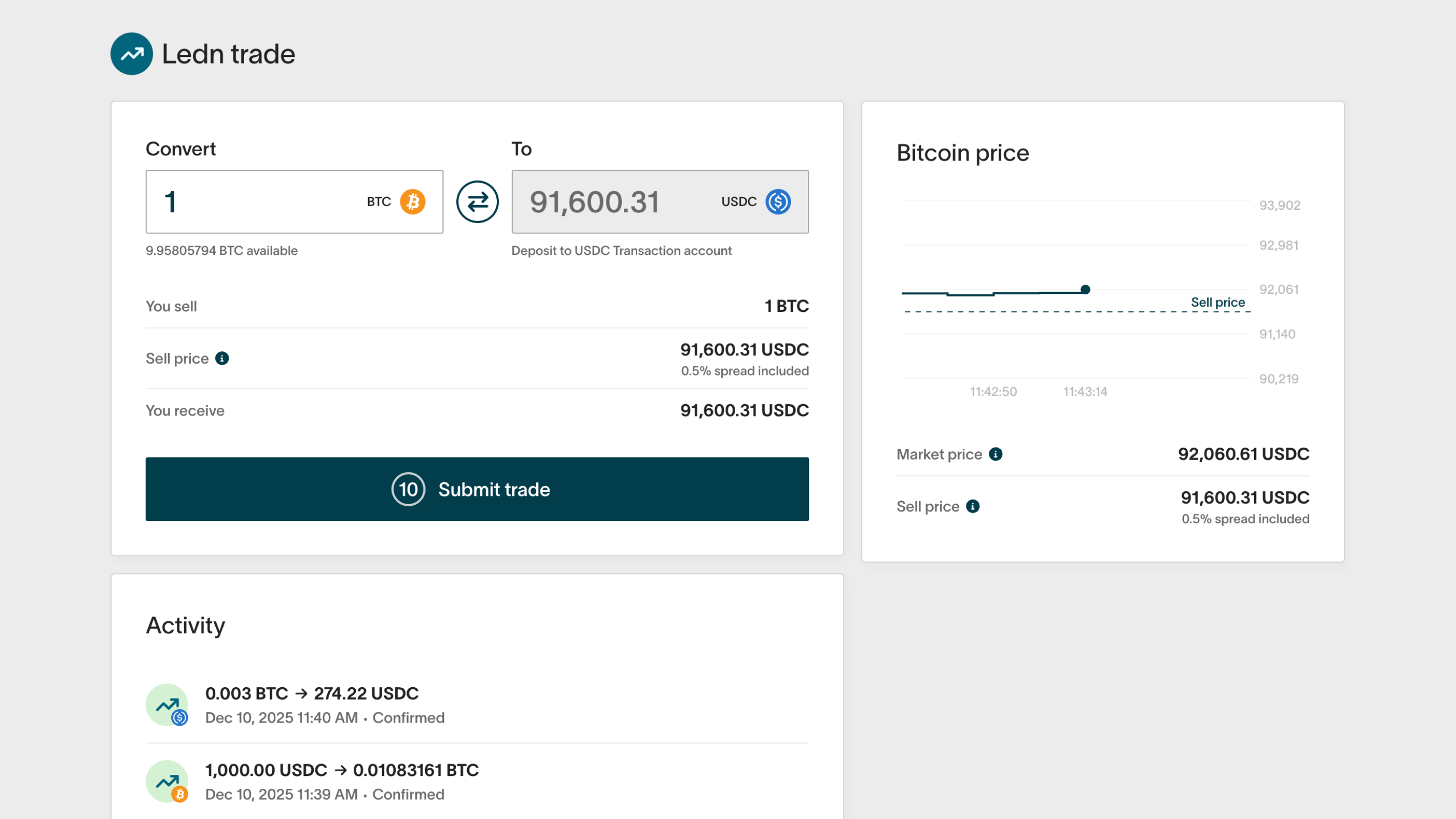 Ver la cantidad de bitcoin, precio de venta/compra, lo que recibes y el porcentaje de spread antes de cada préstamo B2X, trade BTC/USDC o reembolso de préstamo con BTC como colateral.
