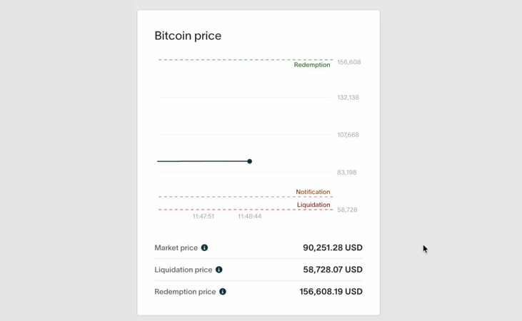 El nuevo rastreador de precio de BTC muestra los niveles de precio clave asociados con tu préstamo, incluyendo el precio al que tu préstamo sería liquidado, el precio para alcanzar 70% LTV (cuando se activa el auto-top-up si está habilitado), el precio en el que puedes redimir colateral excedente, y la cotización de mercado actual de Ledn para el préstamo.