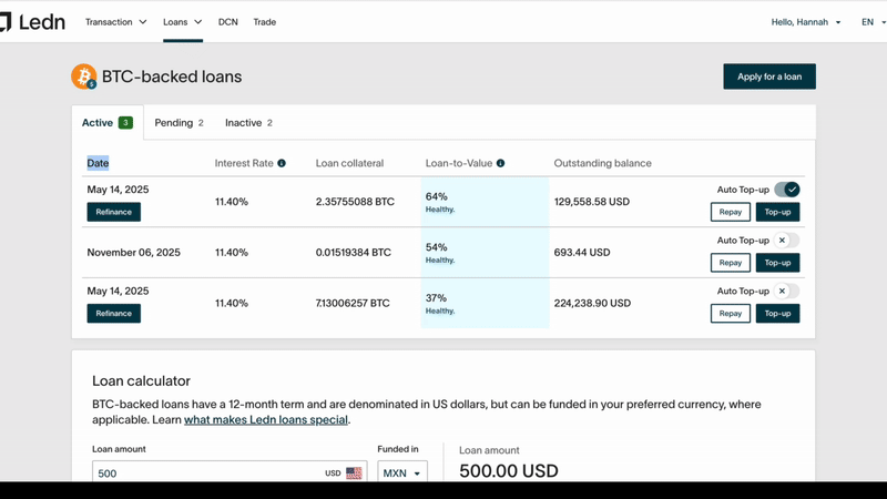 Ahora verás la salud de tu préstamo de un vistazo en tu panel, niveles de precio en tiempo real que activan acciones clave en páginas individuales de préstamo, y precios adelantados de compra/venta para operaciones, B2X y reembolsos en BTC. Además, hemos añadido nuevas funciones a nuestro Informe de Libro Abierto.