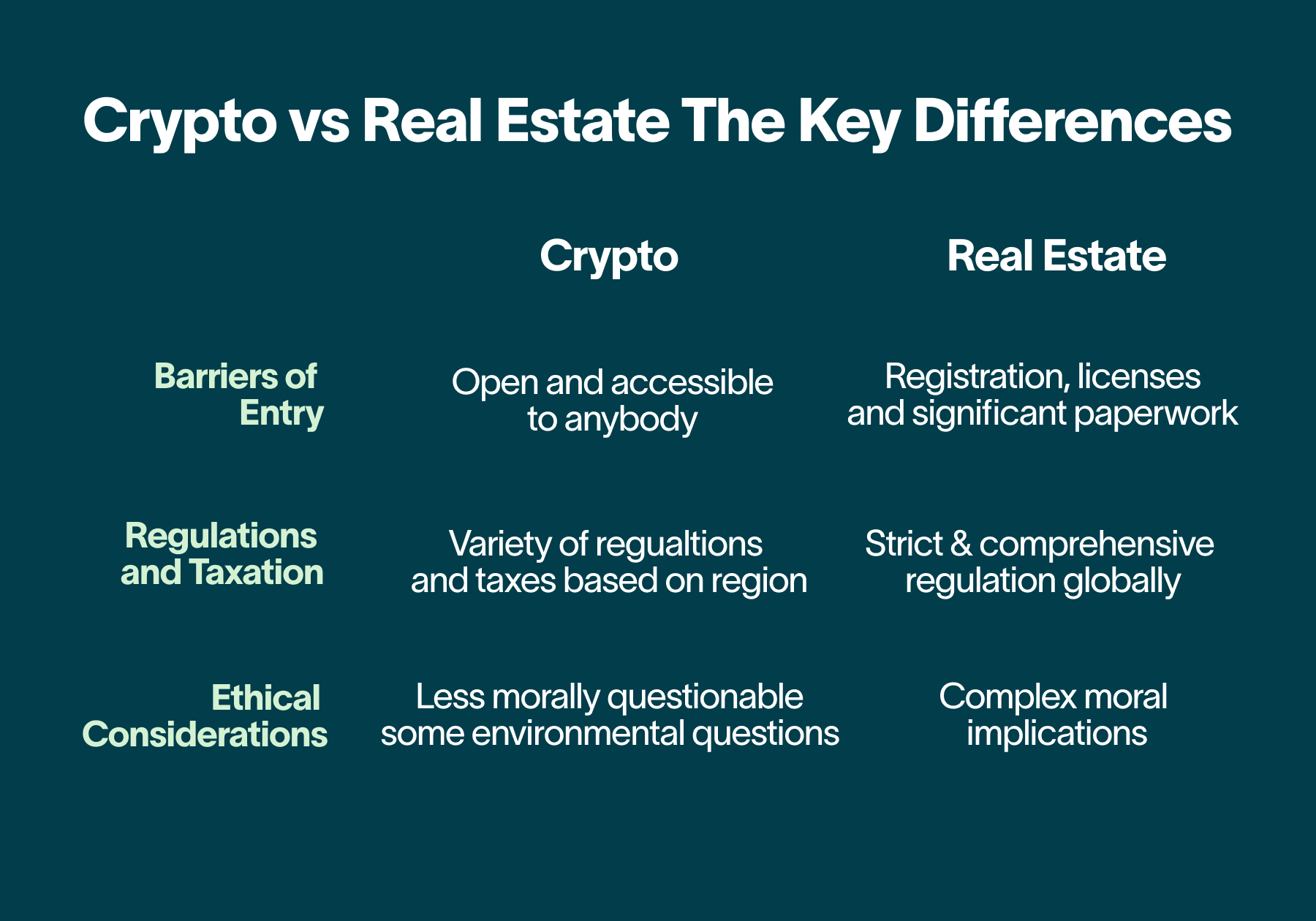 The real estate market comes with some ethical complications that you may or may not need to know about before making an investment decision. The fact that land is such an important part of human life means that governments, courts, and regulators must consider the impacts of real estate development and ownership on communities, the environment, and the economy at large. To some extent, you do not need to actively know about all of these elements unless you are being very hands-on with your investments, but the moral makeup of a sector is something that many people like to keep in mind when making a decision. The crypto market does not come with the same level of considerations, although it also has some environmental question marks surrounding it (especially for Bitcoin).