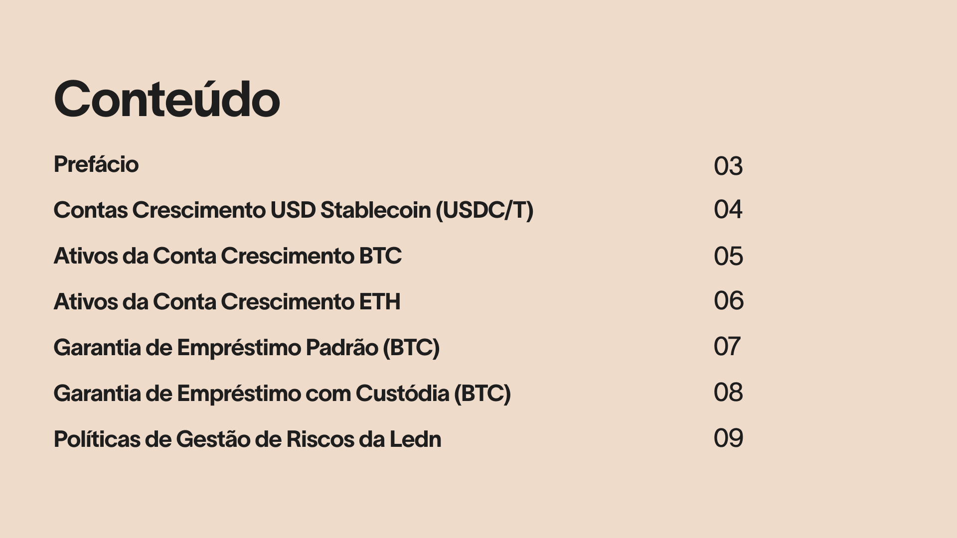 Isenções: Este relatório (incluindo quaisquer dados aqui contidos) é fornecido para os clientes da Ledn Inc. (juntamente com suas afiliadas e subsidiárias, "Ledn") em uma base "como está" e "conforme disponível", a critério exclusivo da Ledn e apenas para fins informativos e educacionais. A Ledn se isenta expressamente de qualquer responsabilidade e de todas as garantias de precisão, integridade, comercialização ou adequação a uma finalidade específica com relação a este relatório. O desempenho passado não é garantia de resultados futuros. Advertimos que a confiança em qualquer declaração prospectiva envolve riscos e incertezas conhecidos e desconhecidos. Leia nossas isenções de responsabilidade completas em https://www.ledn.io/pt/legal/disclaimers